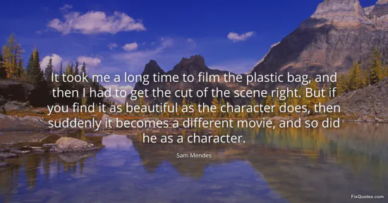 Mendes, Sam. "It took me a long time to film the plastic bag, and then I had to get the cut of the scene right. But if you find it as beautiful as the character does, then suddenly it becomes a different movie, and so did he as a character." FixQuotes. January 15, 2026. https://fixquotes.com/quotes/it-took-me-a-long-time-to-film-the-plastic-bag-18329/.