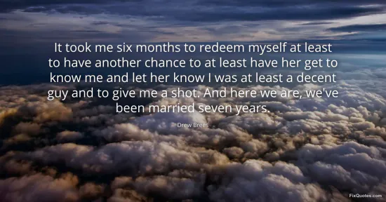 Brees, Drew. (2026, January 17). It took me six months to redeem myself at least to have another chance to at least have her get to know me and let her know I was at least a decent guy and to give me a shot. And here we are, we've been married seven years. FixQuotes. https://fixquotes.com/quotes/it-took-me-six-months-to-redeem-myself-at-least-55019/
