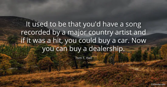 Hall, Tom T. "It used to be that you'd have a song recorded by a major country artist and if it was a hit, you could buy a car. Now you can buy a dealership." FixQuotes. January 17, 2026. https://fixquotes.com/quotes/it-used-to-be-that-youd-have-a-song-recorded-by-a-65532/.