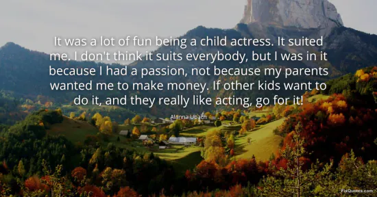 Ubach, Alanna. (2026, February 18). It was a lot of fun being a child actress. It suited me. I don't think it suits everybody, but I was in it because I had a passion, not because my parents wanted me to make money. If other kids want to do it, and they really like acting, go for it! FixQuotes. https://fixquotes.com/quotes/it-was-a-lot-of-fun-being-a-child-actress-it-61642/