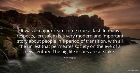 August, Bille. "It was a major dream come true at last. In many respects, Jerusalem is a very modern and important story about people in a period of transition, with all the unrest that permeates society on the eve of a new century. The big life issues are at stake." FixQuotes. January 16, 2026. https://fixquotes.com/quotes/it-was-a-major-dream-come-true-at-last-in-many-123378/.