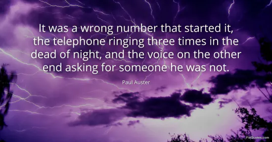 Auster, Paul. (2026, January 16). It was a wrong number that started it, the telephone ringing three times in the dead of night, and the voice on the other end asking for someone he was not. FixQuotes. https://fixquotes.com/quotes/it-was-a-wrong-number-that-started-it-the-128586/