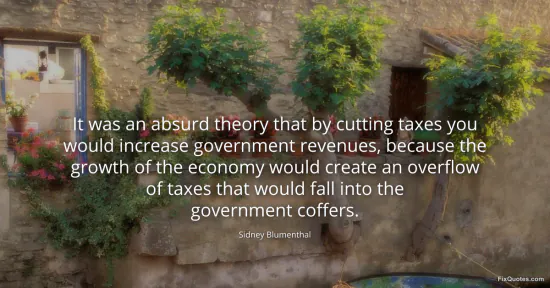 Blumenthal, Sidney. "It was an absurd theory that by cutting taxes you would increase government revenues, because the growth of the economy would create an overflow of taxes that would fall into the government coffers." FixQuotes. January 16, 2026. https://fixquotes.com/quotes/it-was-an-absurd-theory-that-by-cutting-taxes-you-130998/.