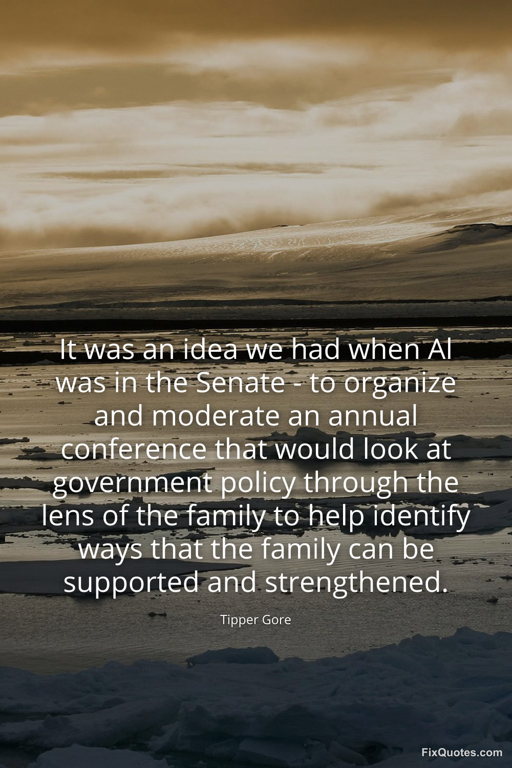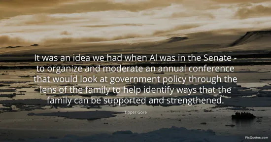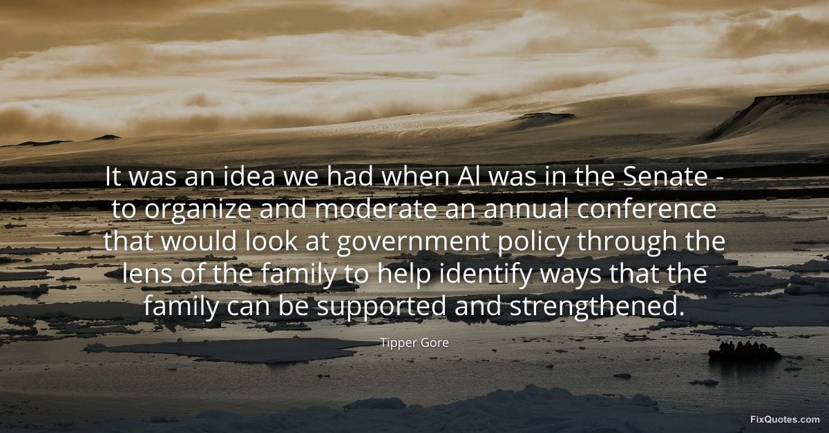 Gore, Tipper. (2026, January 16). It was an idea we had when Al was in the Senate - to organize and moderate an annual conference that would look at government policy through the lens of the family to help identify ways that the family can be supported and strengthened. FixQuotes. https://fixquotes.com/quotes/it-was-an-idea-we-had-when-al-was-in-the-senate-131106/