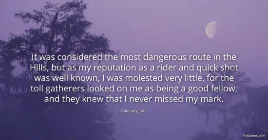Jane, Calamity. "It was considered the most dangerous route in the Hills, but as my reputation as a rider and quick shot was well known, I was molested very little, for the toll gatherers looked on me as being a good fellow, and they knew that I never missed my mark." FixQuotes. January 18, 2026. https://fixquotes.com/quotes/it-was-considered-the-most-dangerous-route-in-the-16917/.