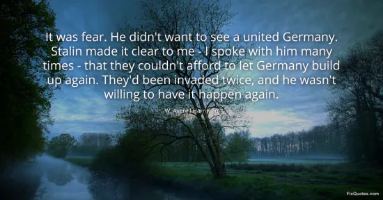 Harriman, W. Averell. "It was fear. He didn't want to see a united Germany. Stalin made it clear to me - I spoke with him many times - that they couldn't afford to let Germany build up again. They'd been invaded twice, and he wasn't willing to have it happen again." FixQuotes. January 15, 2026. https://fixquotes.com/quotes/it-was-fear-he-didnt-want-to-see-a-united-germany-97568/.