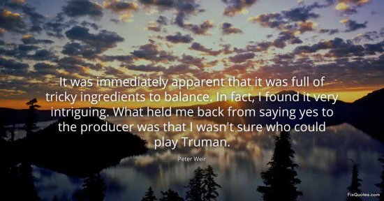 Weir, Peter. "It was immediately apparent that it was full of tricky ingredients to balance. In fact, I found it very intriguing. What held me back from saying yes to the producer was that I wasn't sure who could play Truman." FixQuotes. February 13, 2026. https://fixquotes.com/quotes/it-was-immediately-apparent-that-it-was-full-of-164417/.