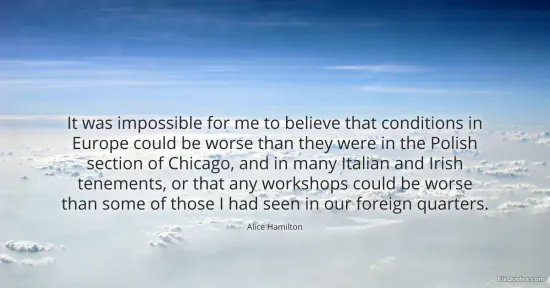 Hamilton, Alice. (2026, January 17). It was impossible for me to believe that conditions in Europe could be worse than they were in the Polish section of Chicago, and in many Italian and Irish tenements, or that any workshops could be worse than some of those I had seen in our foreign quarters. FixQuotes. https://fixquotes.com/quotes/it-was-impossible-for-me-to-believe-that-37266/