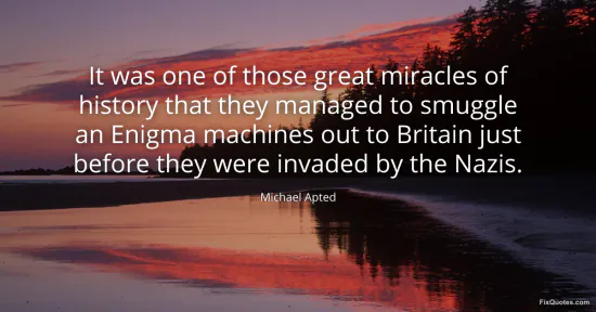 Apted, Michael. "It was one of those great miracles of history that they managed to smuggle an Enigma machines out to Britain just before they were invaded by the Nazis." FixQuotes. January 16, 2026. https://fixquotes.com/quotes/it-was-one-of-those-great-miracles-of-history-88980/.