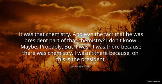 Lewinsky, Monica. "It was that chemistry. And was the fact that he was president part of that chemistry? I don't know. Maybe. Probably. But it was - I was there because there was chemistry. I wasn't there because, oh, this is the president." FixQuotes. January 17, 2026. https://fixquotes.com/quotes/it-was-that-chemistry-and-was-the-fact-that-he-80165/.
