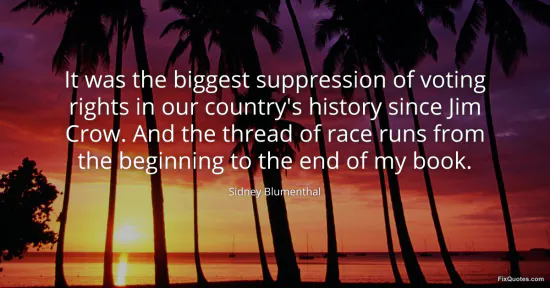 Blumenthal, Sidney. "It was the biggest suppression of voting rights in our country's history since Jim Crow. And the thread of race runs from the beginning to the end of my book." FixQuotes. January 16, 2026. https://fixquotes.com/quotes/it-was-the-biggest-suppression-of-voting-rights-95472/.