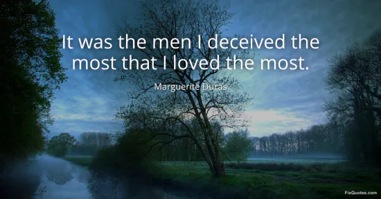 Duras, Marguerite. (2026, January 16). It was the men I deceived the most that I loved the most. FixQuotes. https://fixquotes.com/quotes/it-was-the-men-i-deceived-the-most-that-i-loved-95288/