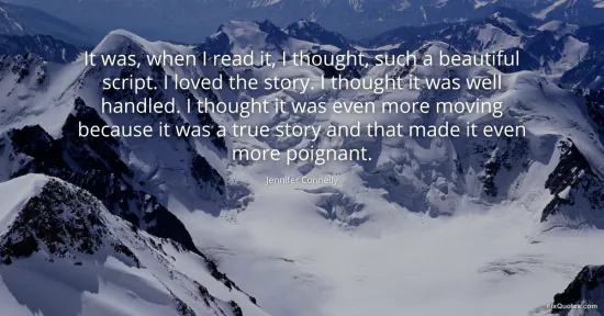 Connelly, Jennifer. "It was, when I read it, I thought, such a beautiful script. I loved the story. I thought it was well handled. I thought it was even more moving because it was a true story and that made it even more poignant." FixQuotes. January 17, 2026. https://fixquotes.com/quotes/it-was-when-i-read-it-i-thought-such-a-beautiful-55792/.