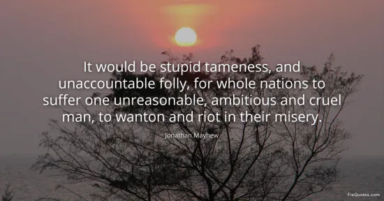 Mayhew doesn’t plead; he indicts. Calling mass submission “stupid tameness” is less sermon than civic slap, a deliberate humiliation meant to make obedience feel not pious but pathetic. The line’s power comes from its moral inversion: the truly “unaccountable folly” isn’t rebellion against authority, it’s the collective choice to keep absorbing harm from a single “unreasonable, ambitious and cruel man.” He frames tyranny as a kind of public self-harm - and by doing so, he reallocates responsibility. The tyrant is guilty, yes, but the nation that tolerates him becomes complicit in its own misery.