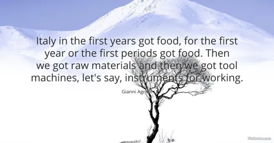Agnelli, Gianni. (2026, January 17). Italy in the first years got food, for the first year or the first periods got food. Then we got raw materials and then we got tool machines, let's say, instruments for working. FixQuotes. https://fixquotes.com/quotes/italy-in-the-first-years-got-food-for-the-first-62226/