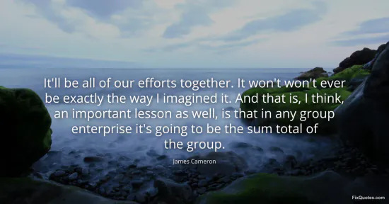 Cameron, James. (2026, January 16). It'll be all of our efforts together. It won't won't ever be exactly the way I imagined it. And that is, I think, an important lesson as well, is that in any group enterprise it's going to be the sum total of the group. FixQuotes. https://fixquotes.com/quotes/itll-be-all-of-our-efforts-together-it-wont-wont-95427/