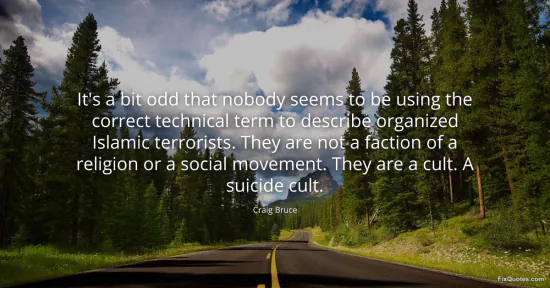 Bruce, Craig. "It's a bit odd that nobody seems to be using the correct technical term to describe organized Islamic terrorists. They are not a faction of a religion or a social movement. They are a cult. A suicide cult." FixQuotes. January 15, 2026. https://fixquotes.com/quotes/its-a-bit-odd-that-nobody-seems-to-be-using-the-140719/.