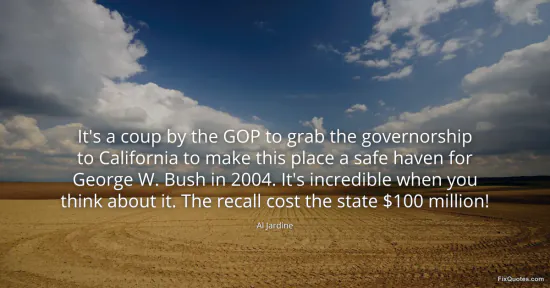Jardine, Al. "It's a coup by the GOP to grab the governorship to California to make this place a safe haven for George W. Bush in 2004. It's incredible when you think about it. The recall cost the state $100 million!" FixQuotes. February 19, 2026. https://fixquotes.com/quotes/its-a-coup-by-the-gop-to-grab-the-governorship-to-44934/.