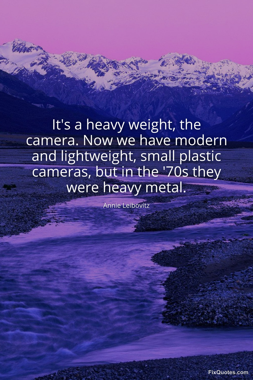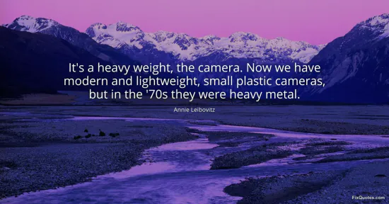 Leibovitz, Annie. "It's a heavy weight, the camera. Now we have modern and lightweight, small plastic cameras, but in the '70s they were heavy metal." FixQuotes. January 18, 2026. https://fixquotes.com/quotes/its-a-heavy-weight-the-camera-now-we-have-modern-11665/.