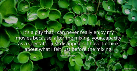 Almodovar, Pedro. (2026, January 17). It's a pity that I can never really enjoy my movies because, after the mixing, your capacity as a spectator just disappears. I have to think about what I felt just before the mixing. FixQuotes. https://fixquotes.com/quotes/its-a-pity-that-i-can-never-really-enjoy-my-80227/