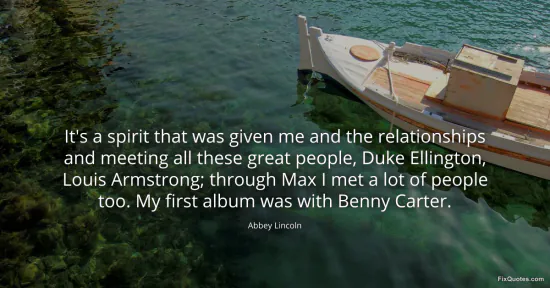 Lincoln, Abbey. (2026, January 17). It's a spirit that was given me and the relationships and meeting all these great people, Duke Ellington, Louis Armstrong; through Max I met a lot of people too. My first album was with Benny Carter. FixQuotes. https://fixquotes.com/quotes/its-a-spirit-that-was-given-me-and-the-63358/
