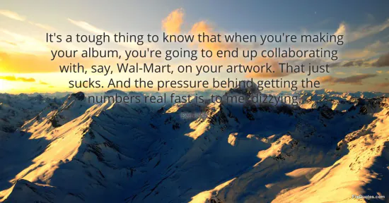 "It's a tough thing to know that when you're making your album, you're going to end up collaborating with, say, Wal-Mart, on your artwork. That just sucks. And the pressure behind getting the numbers real fast is, to me, dizzying." FixQuotes, 16 Jan. 2026, https://fixquotes.com/quotes/its-a-tough-thing-to-know-that-when-youre-making-138205/. Accessed 12 Feb. 2026.