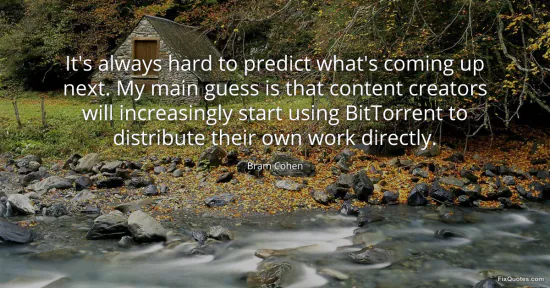 "It's always hard to predict what's coming up next. My main guess is that content creators will increasingly start using BitTorrent to distribute their own work directly." FixQuotes, 17 Jan. 2026, https://fixquotes.com/quotes/its-always-hard-to-predict-whats-coming-up-next-41769/. Accessed 12 Feb. 2026.