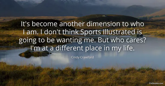 Crawford, Cindy. (2026, January 17). It's become another dimension to who I am. I don't think Sports Illustrated is going to be wanting me. But who cares? I'm at a different place in my life. FixQuotes. https://fixquotes.com/quotes/its-become-another-dimension-to-who-i-am-i-dont-42255/