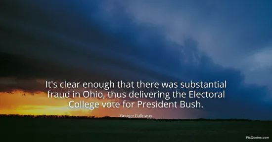 Galloway, George. (n.d.). It's clear enough that there was substantial fraud in Ohio, thus delivering the Electoral College vote for President Bush. FixQuotes. https://fixquotes.com/quotes/its-clear-enough-that-there-was-substantial-fraud-94509/