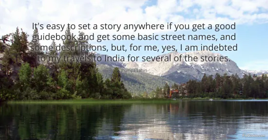 Lahiri, Jhumpa. "It's easy to set a story anywhere if you get a good guidebook and get some basic street names, and some descriptions, but, for me, yes, I am indebted to my travels to India for several of the stories." FixQuotes. January 15, 2026. https://fixquotes.com/quotes/its-easy-to-set-a-story-anywhere-if-you-get-a-142929/.