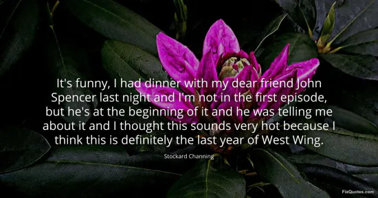 Channing, Stockard. "It's funny, I had dinner with my dear friend John Spencer last night and I'm not in the first episode, but he's at the beginning of it and he was telling me about it and I thought this sounds very hot because I think this is definitely the last year of West Wing." FixQuotes. January 14, 2026. https://fixquotes.com/quotes/its-funny-i-had-dinner-with-my-dear-friend-john-119706/.
