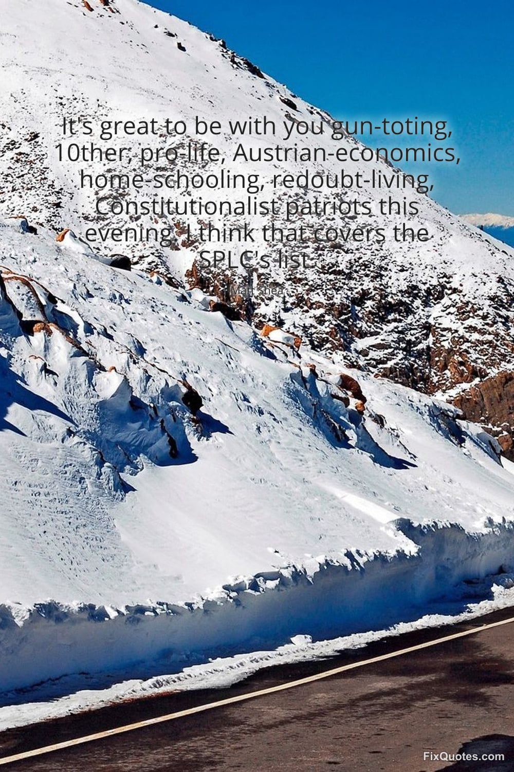 Shea, Matt. (2026, February 9). It's great to be with you gun-toting, 10ther, pro-life, Austrian-economics, home-schooling, redoubt-living, Constitutionalist patriots this evening. I think that covers the SPLC's list. FixQuotes. https://fixquotes.com/quotes/its-great-to-be-with-you-gun-toting-10ther-184989/