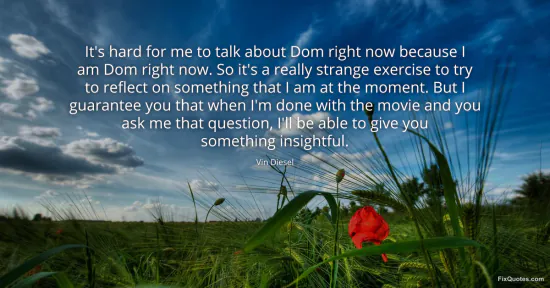 Diesel, Vin. "It's hard for me to talk about Dom right now because I am Dom right now. So it's a really strange exercise to try to reflect on something that I am at the moment. But I guarantee you that when I'm done with the movie and you ask me that question, I'll be able to give you something insightful." FixQuotes. January 16, 2026. https://fixquotes.com/quotes/its-hard-for-me-to-talk-about-dom-right-now-97565/.