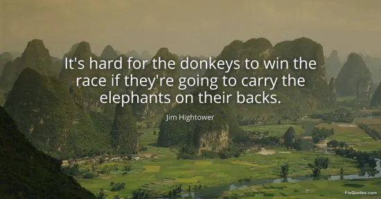 Hightower, Jim. "It's hard for the donkeys to win the race if they're going to carry the elephants on their backs." FixQuotes. January 14, 2026. https://fixquotes.com/quotes/its-hard-for-the-donkeys-to-win-the-race-if-73965/.