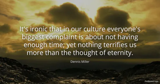 Miller, Dennis. "It's ironic that in our culture everyone's biggest complaint is about not having enough time; yet nothing terrifies us more than the thought of eternity." FixQuotes. January 17, 2026. https://fixquotes.com/quotes/its-ironic-that-in-our-culture-everyones-biggest-30783/.