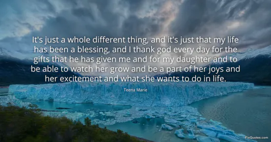 Marie, Teena. "It's just a whole different thing, and it's just that my life has been a blessing, and I thank god every day for the gifts that he has given me and for my daughter and to be able to watch her grow and be a part of her joys and her excitement and what she wants to do in life." FixQuotes. January 16, 2026. https://fixquotes.com/quotes/its-just-a-whole-different-thing-and-its-just-95058/.