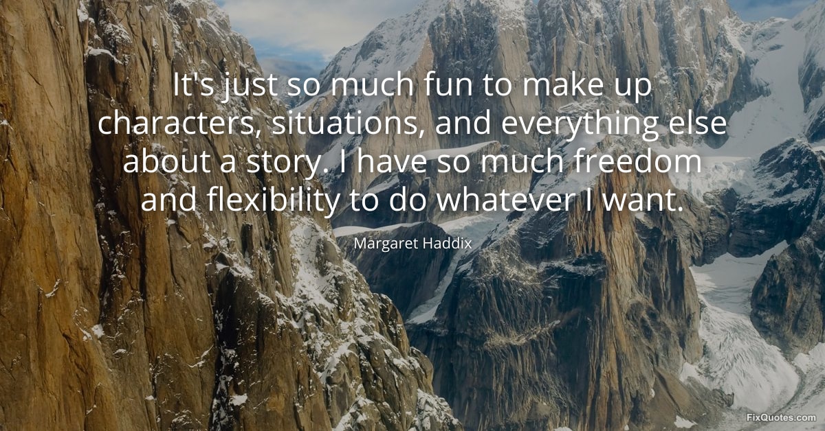 Haddix, Margaret. (2026, January 16). It's just so much fun to make up characters, situations, and everything else about a story. I have so much freedom and flexibility to do whatever I want. FixQuotes. https://fixquotes.com/quotes/its-just-so-much-fun-to-make-up-characters-99281/