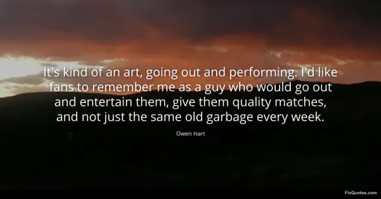 Hart, Owen. "It's kind of an art, going out and performing. I'd like fans to remember me as a guy who would go out and entertain them, give them quality matches, and not just the same old garbage every week." FixQuotes. January 17, 2026. https://fixquotes.com/quotes/its-kind-of-an-art-going-out-and-performing-id-73106/.