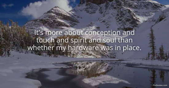 Metheny isn’t making a coy metaphor about sex so much as drawing a hard line between the parts you can inventory and the parts that actually make art move. “Hardware” is deliberately blunt: it’s the language of gear forums, clinic talk, the fetish culture of instruments and specs. By tossing it off as something that may or may not be “in place,” he punctures the fantasy that mastery is a matter of owning the right machine or having the “correct” physical setup. He’s reminding you that the most expensive rig in the world can still sound emotionally vacant.