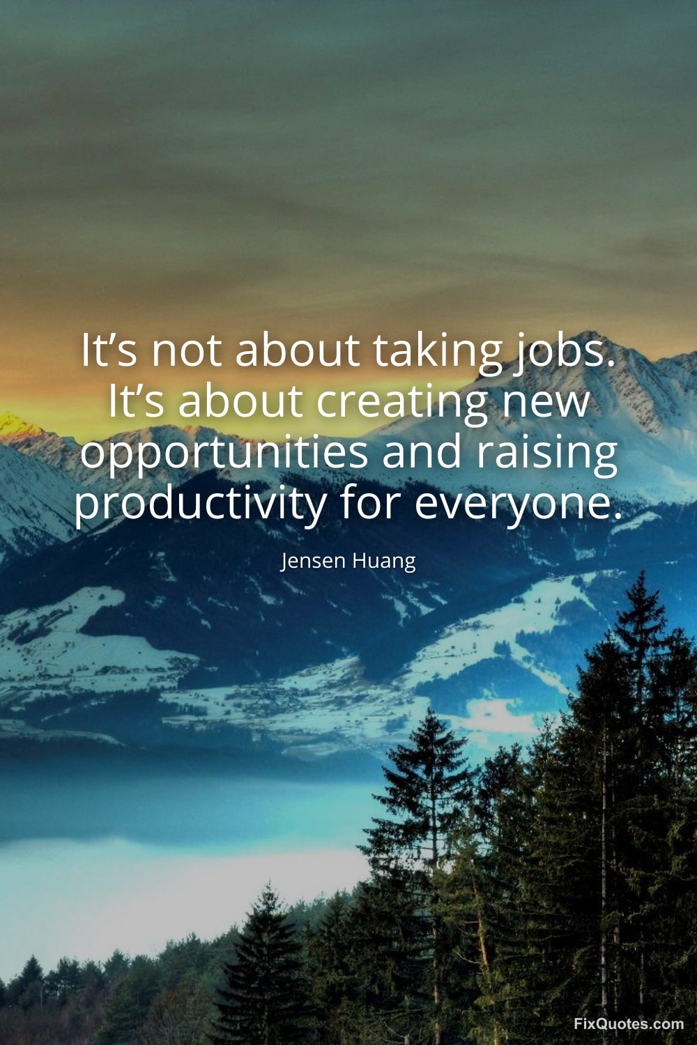 Huang, Jensen. "It’s not about taking jobs. It’s about creating new opportunities and raising productivity for everyone." FixQuotes. January 30, 2026. https://fixquotes.com/quotes/its-not-about-taking-jobs-its-about-creating-new-184734/.