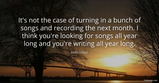 Urban, Keith. "It's not the case of turning in a bunch of songs and recording the next month. I think you're looking for songs all year long and you're writing all year long." FixQuotes. January 15, 2026. https://fixquotes.com/quotes/its-not-the-case-of-turning-in-a-bunch-of-songs-162772/.