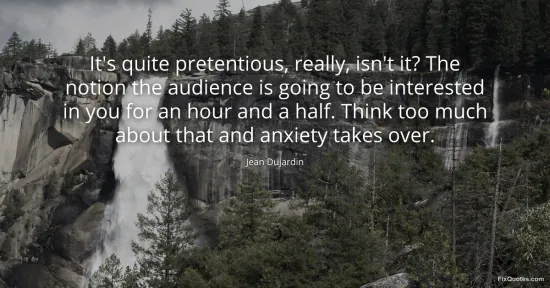 Dujardin, Jean. "It's quite pretentious, really, isn't it? The notion the audience is going to be interested in you for an hour and a half. Think too much about that and anxiety takes over." FixQuotes. January 18, 2026. https://fixquotes.com/quotes/its-quite-pretentious-really-isnt-it-the-notion-21803/.