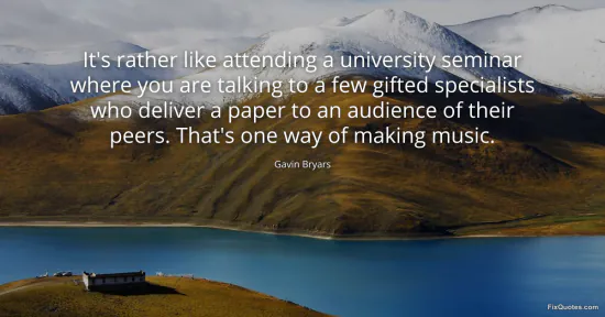Bryars, Gavin. "It's rather like attending a university seminar where you are talking to a few gifted specialists who deliver a paper to an audience of their peers. That's one way of making music." FixQuotes. January 17, 2026. https://fixquotes.com/quotes/its-rather-like-attending-a-university-seminar-61413/.