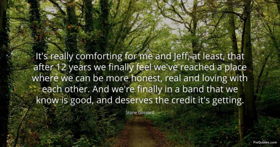 Gossard, Stone. "It's really comforting for me and Jeff, at least, that after 12 years we finally feel we've reached a place where we can be more honest, real and loving with each other. And we're finally in a band that we know is good, and deserves the credit it's getting." FixQuotes. January 15, 2026. https://fixquotes.com/quotes/its-really-comforting-for-me-and-jeff-at-least-107183/.