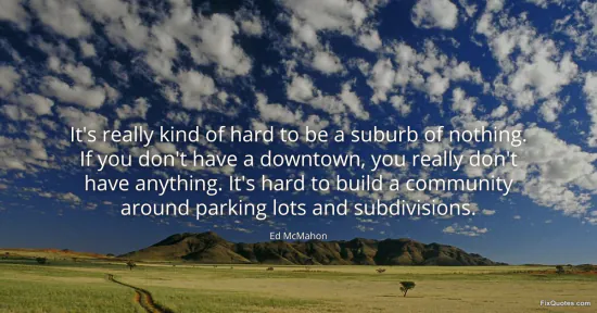 McMahon, Ed. (2026, January 17). It's really kind of hard to be a suburb of nothing. If you don't have a downtown, you really don't have anything. It's hard to build a community around parking lots and subdivisions. FixQuotes. https://fixquotes.com/quotes/its-really-kind-of-hard-to-be-a-suburb-of-nothing-76897/
