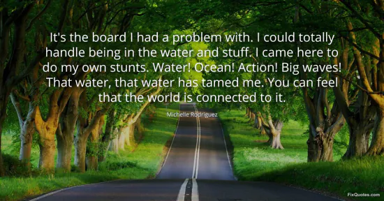 Rodriguez, Michelle. (2026, January 17). It's the board I had a problem with. I could totally handle being in the water and stuff. I came here to do my own stunts. Water! Ocean! Action! Big waves! That water, that water has tamed me. You can feel that the world is connected to it. FixQuotes. https://fixquotes.com/quotes/its-the-board-i-had-a-problem-with-i-could-67736/