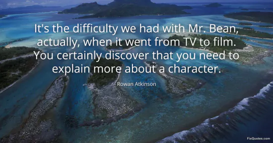 "It's the difficulty we had with Mr. Bean, actually, when it went from TV to film. You certainly discover that you need to explain more about a character." FixQuotes, 18 Jan. 2026, https://fixquotes.com/quotes/its-the-difficulty-we-had-with-mr-bean-actually-4817/. Accessed 13 Feb. 2026.