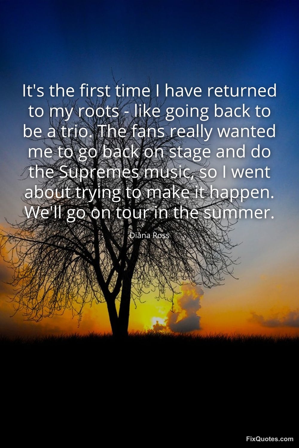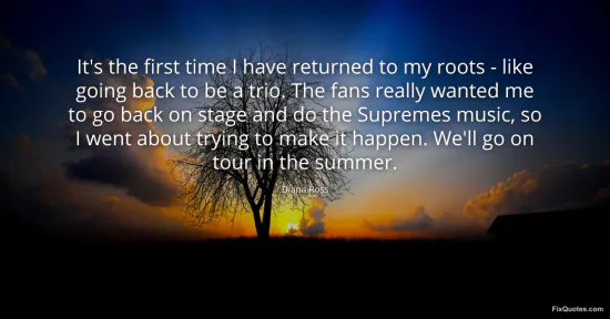 Ross, Diana. (2026, January 17). It's the first time I have returned to my roots - like going back to be a trio. The fans really wanted me to go back on stage and do the Supremes music, so I went about trying to make it happen. We'll go on tour in the summer. FixQuotes. https://fixquotes.com/quotes/its-the-first-time-i-have-returned-to-my-roots-52569/