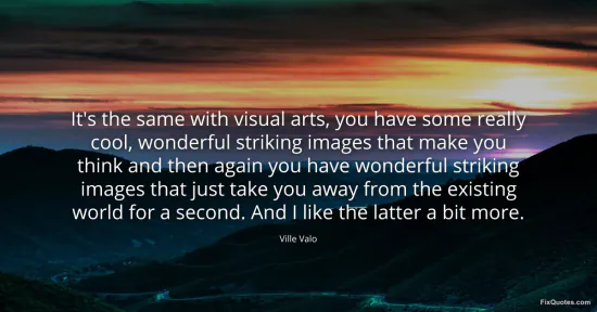 Valo, Ville. (2026, January 15). It's the same with visual arts, you have some really cool, wonderful striking images that make you think and then again you have wonderful striking images that just take you away from the existing world for a second. And I like the latter a bit more. FixQuotes. https://fixquotes.com/quotes/its-the-same-with-visual-arts-you-have-some-168654/
