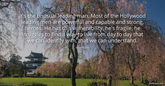 Rydell, Mark. "It's the unusual leading man. Most of the Hollywood leading men are powerful and capable and strong, heroes. He has this vulnerability, he's fragile, he struggles to find a way to live from day to day that we can identify with, that we can understand." FixQuotes. January 15, 2026. https://fixquotes.com/quotes/its-the-unusual-leading-man-most-of-the-hollywood-159159/.